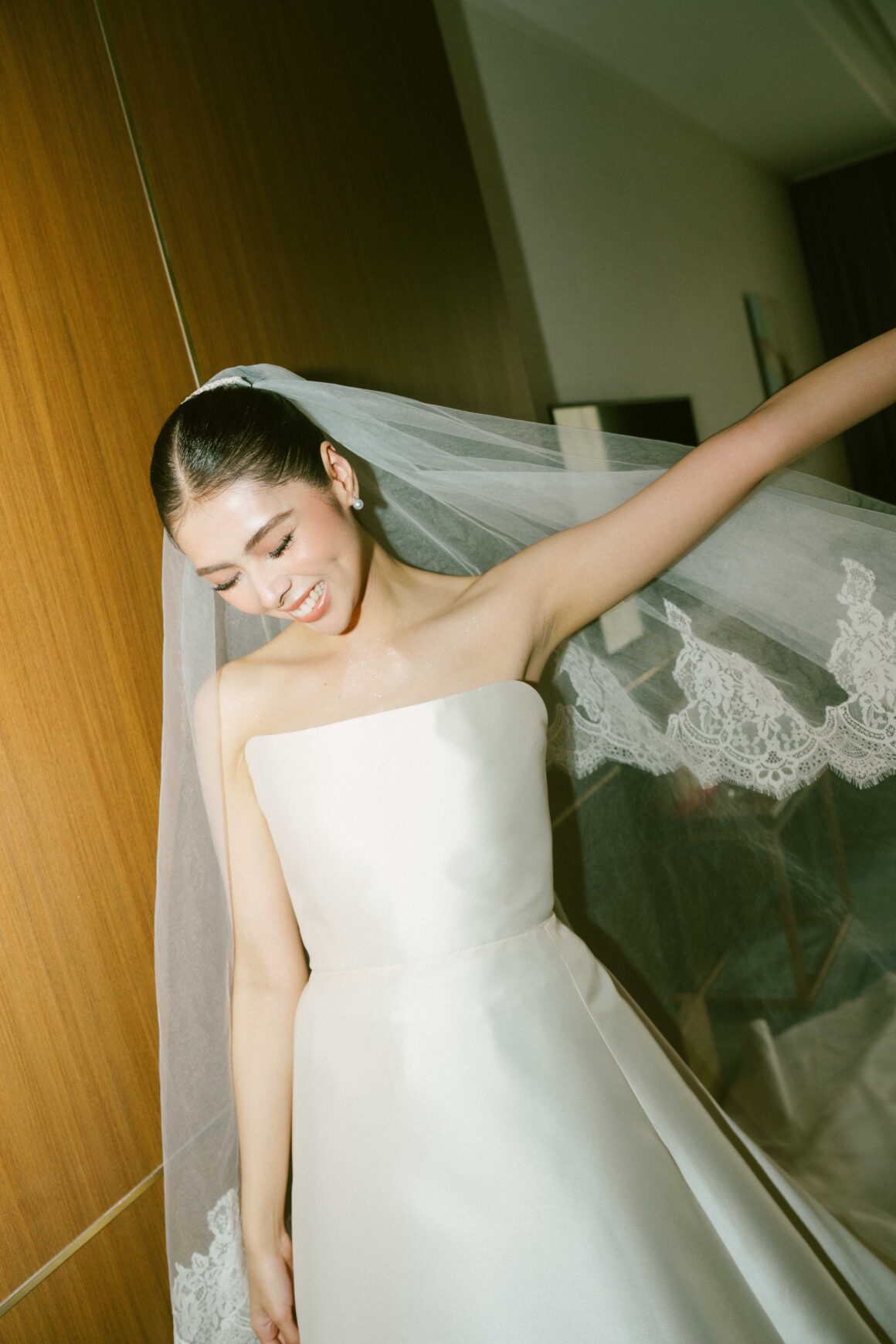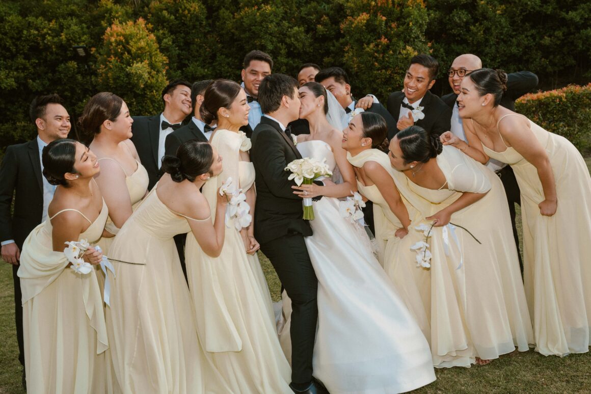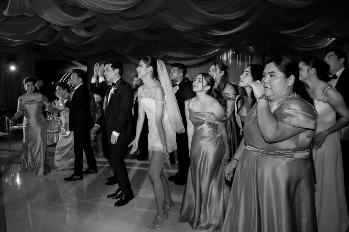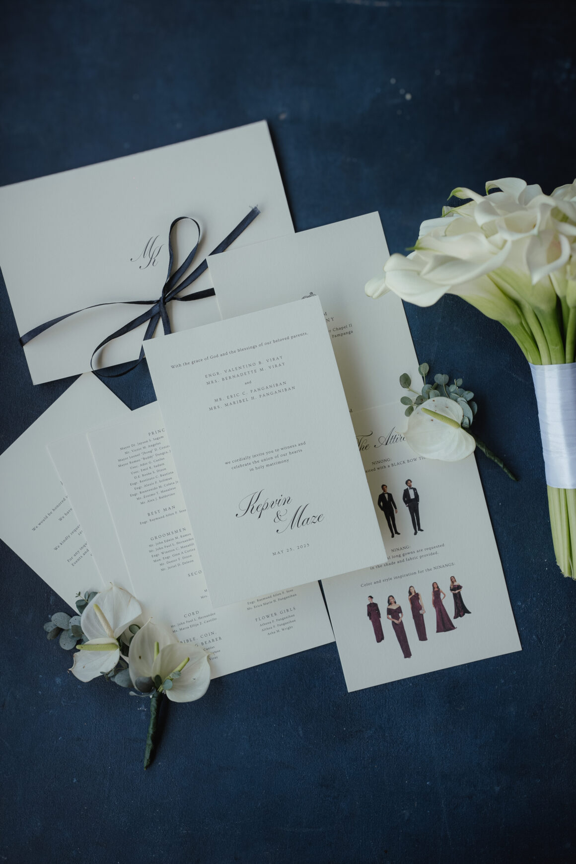Kepvin and Maze’s Dream Team: Coordinator / planner: Voltaire Zalamea | Church: St. Joseph the Worker | Venue and Food: Hilton Clark | florist / Event Styling: Badang Rueda | Photography: Jaja Samaniego | Videography: Amady Manila | Host: Eri Neeman | Hair: Aries Manal | Makeup: Mark Qua | Entourage make-up: Anna Tiglao , Karla Ferreras and Ralph Sapno | Bridal gown: Debutante Bkk |Bridesmaids’ gowns: Mich Viray | Groom’s suit, flower girls’ dresses, bridal robe, and after-party dress: Dore Bridal Co | Singer: Jemma Catuns | Band: Mahestra PH Official | DJ: Adams Cabrera | Cake and souvenirs: Caking Giant | Photobooth: Beyond The Booth PH | Bloom bar: Panand Charlie PH Hyanneyyy | Lights / sounds: Cuatro Sprolights and Sounds | Invites and souvenir prints: Print and Company | Table number prints: Print Side Studio | Thank you and menu cards: 952 Printing Services | VIP souvenirs: Patisserie Le Choux Colat | Sugar cookies: Love at 1stbite_ | Creative Designs for prints: Erica Panganiban