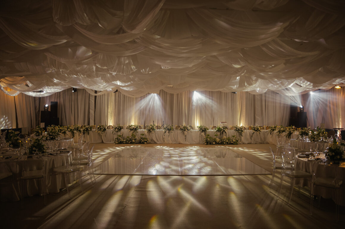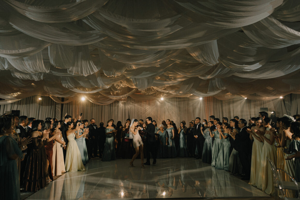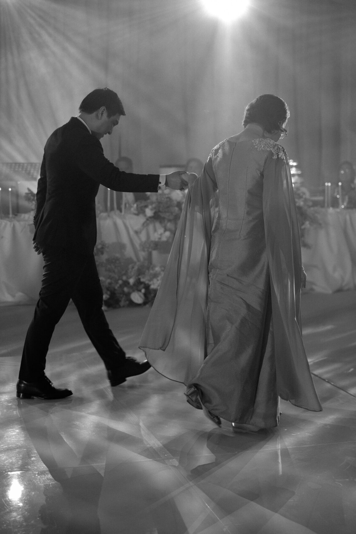 With minimal flowers and warm draping, the elegant layout—suggested by celebrated event stylist Badang Rueda—brought guests together in a “firing squad” formation that kept everyone connected. “Even with 140 guests, it felt like 20,” she added.