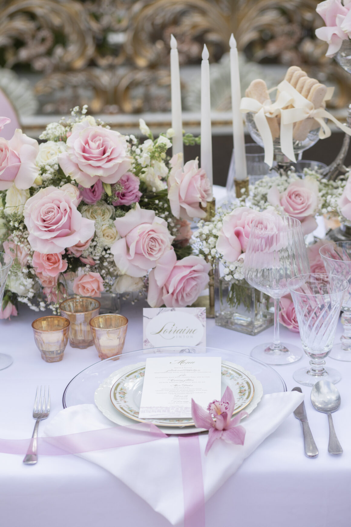 Delicate gold and silver accents provided the aristocratic touch, gilded candelabras, mirrored tablescapes, and baroque-inspired frames that looked like they belonged in a duchess’s drawing room. Every design element harmonized with the Bridgerton aesthetic: romantic, refined, yet grounded in nature’s beauty.