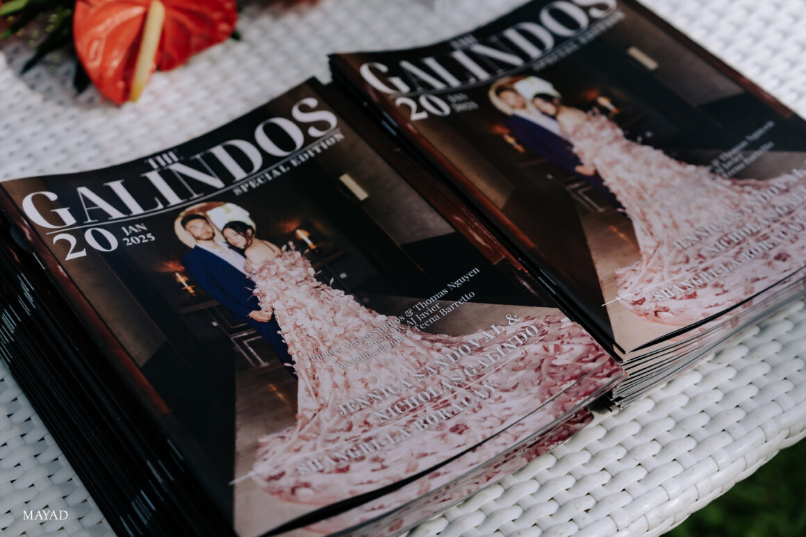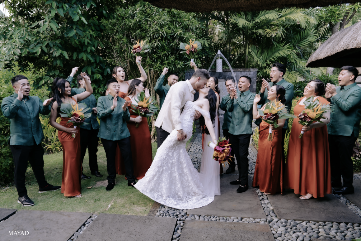 Their wedding, held in the picturesque setting of Boracay, embraced a vibrant tropical palette inspired by Jennica’s family’s Indian wedding. Personal touches included custom napkins with Juice and Wally’s faces, and a unique bar sign proclaiming ‘Drinks on us!’ Their wedding logo, NJ with a palm tree, symbolized the iconic moment of Nick’s proposal amidst palm trees, coming full circle on their special day.