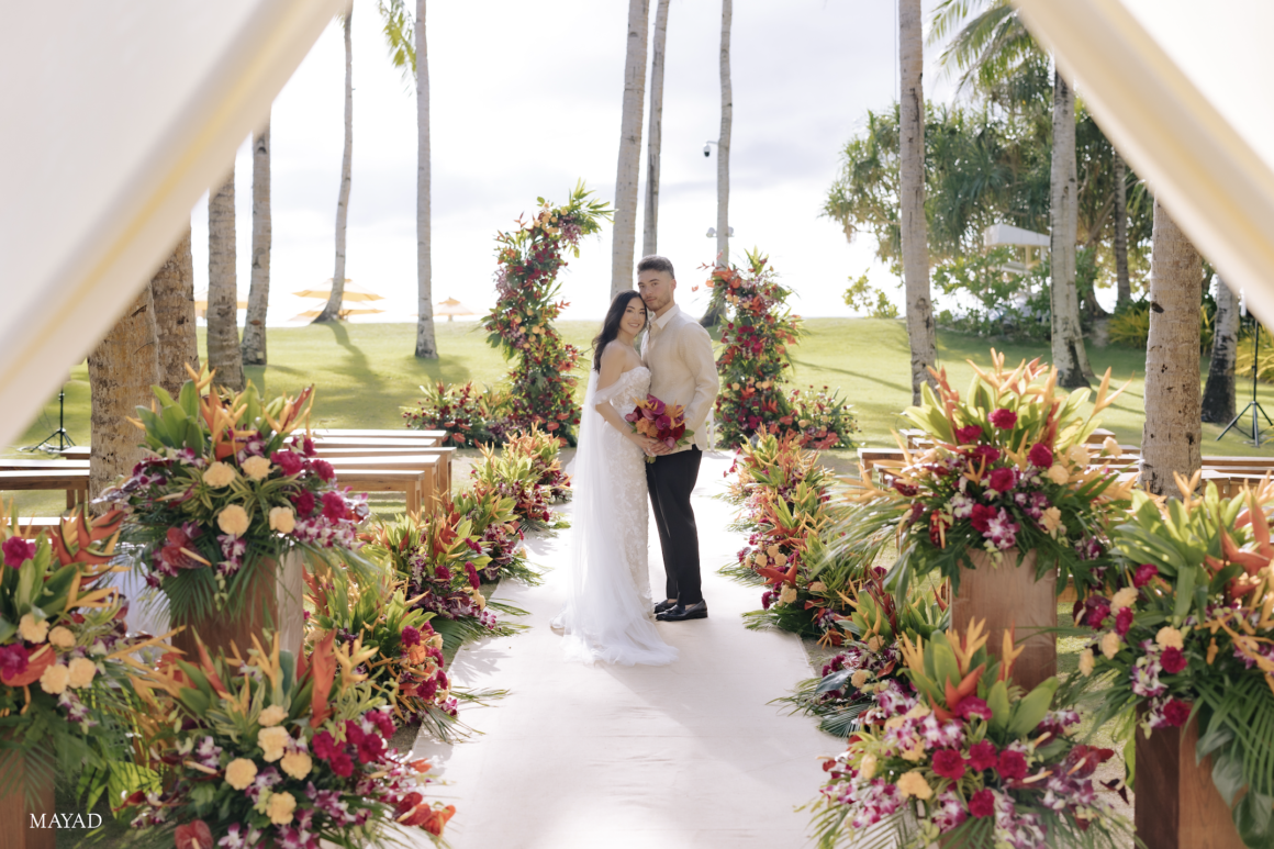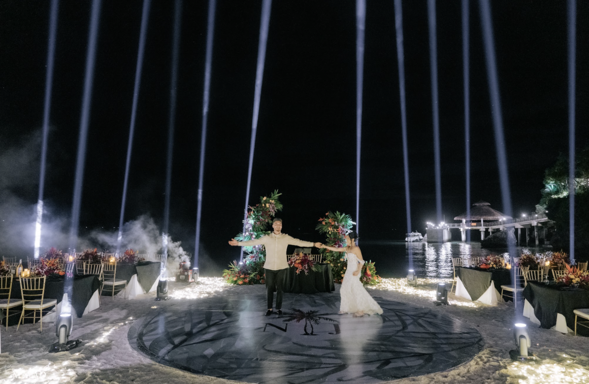 A standout moment was their surprise first dance on the beach, illuminated by sky-high light beams synced to their dance moves, leaving guests mesmerized. This, coupled with a tropical elegance theme, perfectly mirrored their sophisticated yet carefree personalities.