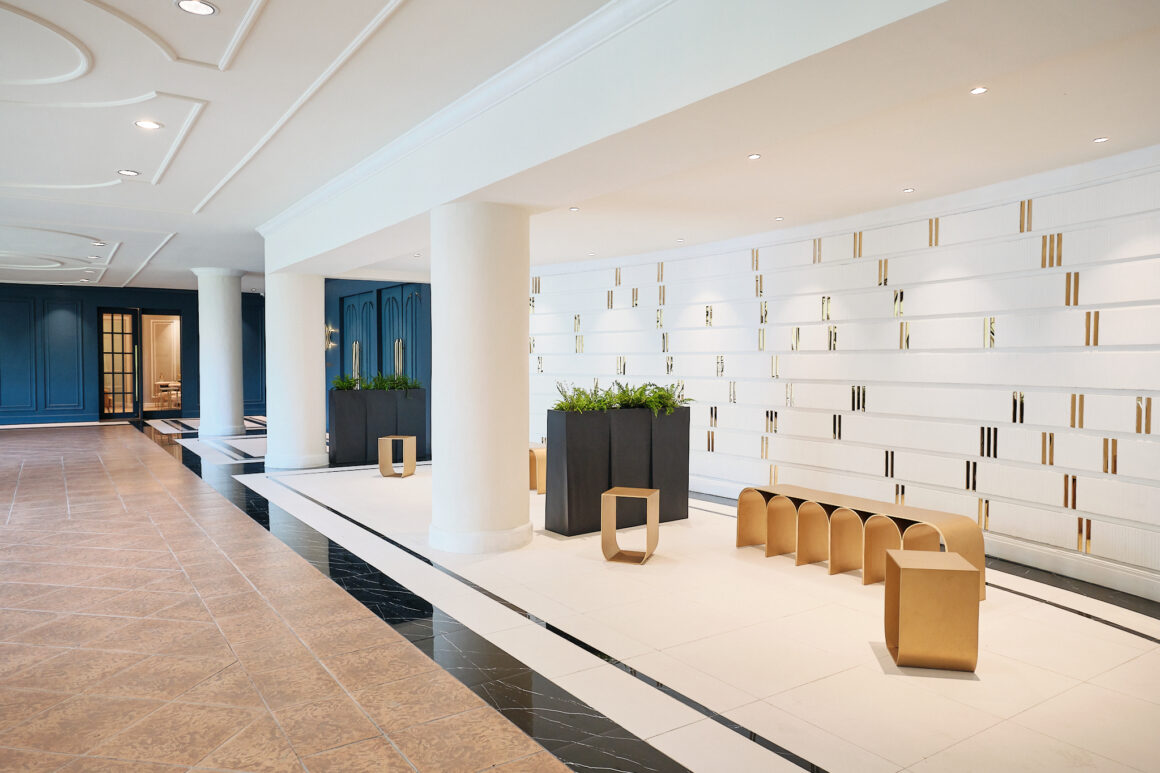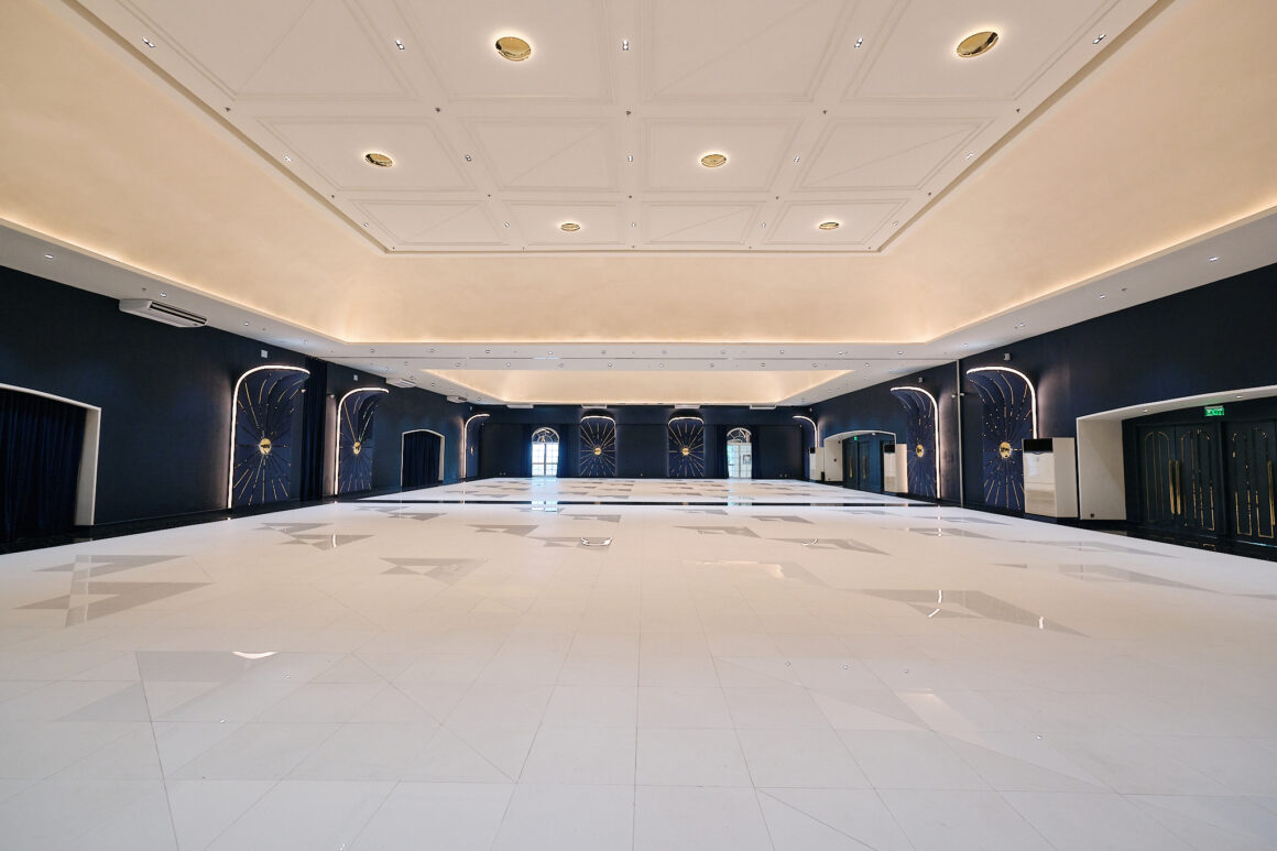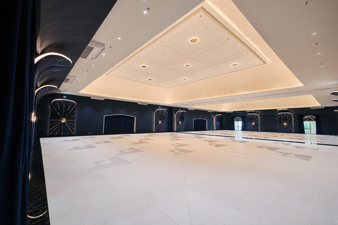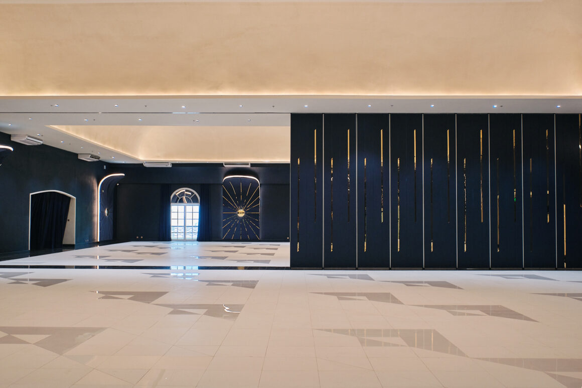 Cleo offers two stunning halls that can be used individually for more intimate gatherings or combined to host elevated celebrations. Each hall is bathed in a rich, gorgeous shade of blue, accented by graceful gold detailing — a palette that evokes timeless refinement. Moreover, the versatility of this venue makes it ideal to scale seamlessly with your vision for your big day.