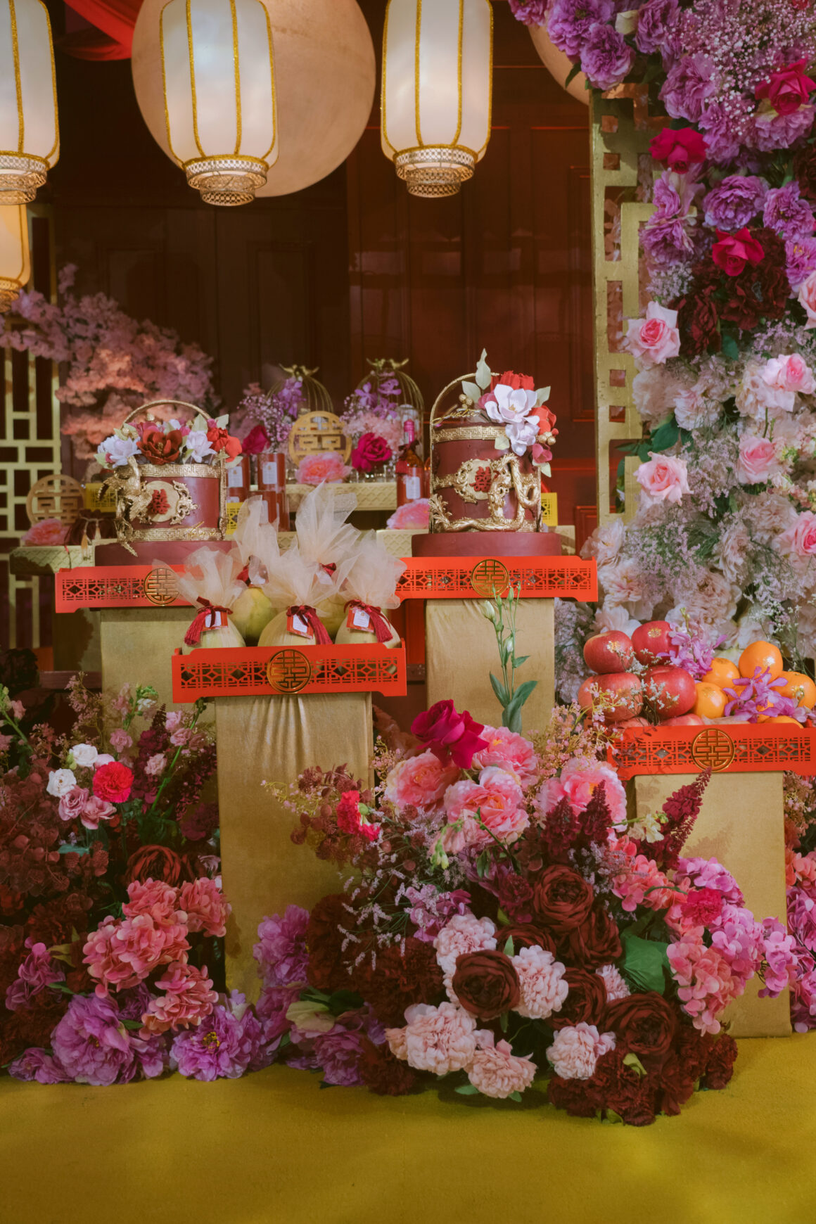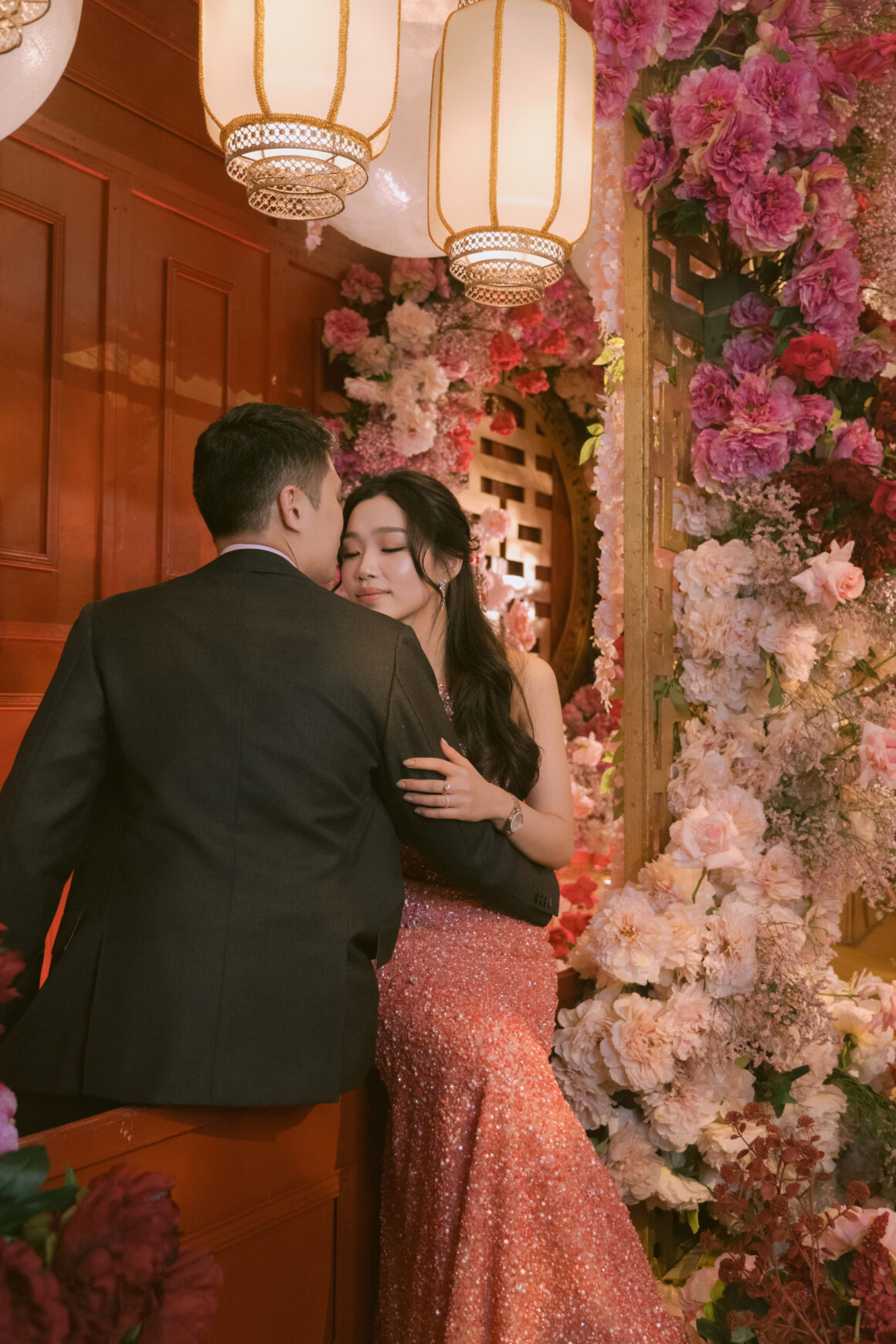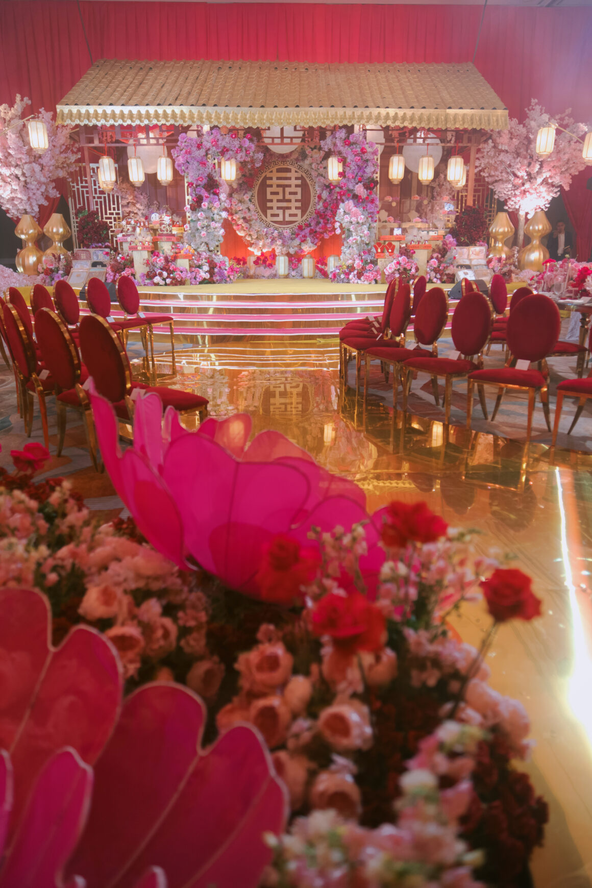The couple also leaned into meaningful details. They dressed the day in hot pink and gold, a modern echo of traditional red, symbolizing joy and vitality. Peonies (牡丹 mǔdān) adorned the space, carrying the wish that both families flourish in harmony.