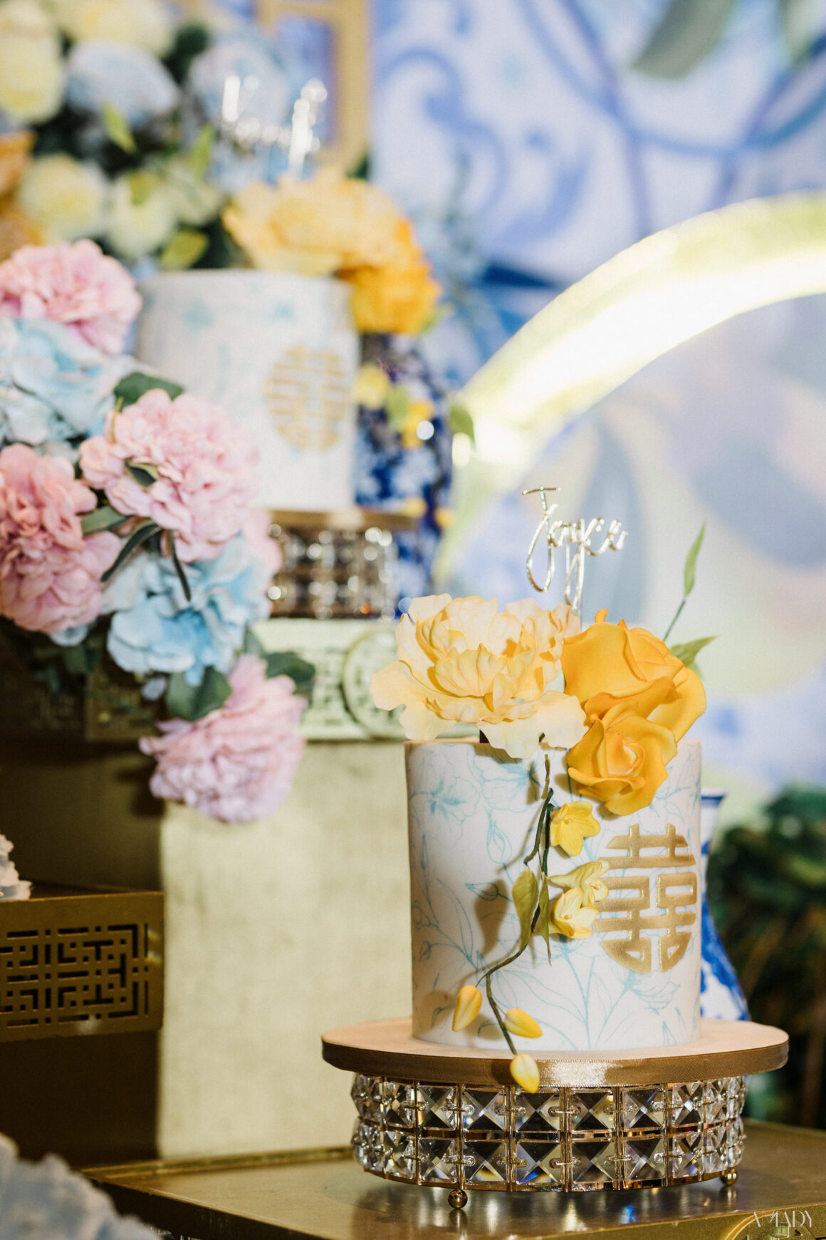 Inspired by the Amalfi Coast, the couple chose cheerful blue and yellow hues with chinoiserie details as a nod to their Chinese roots.