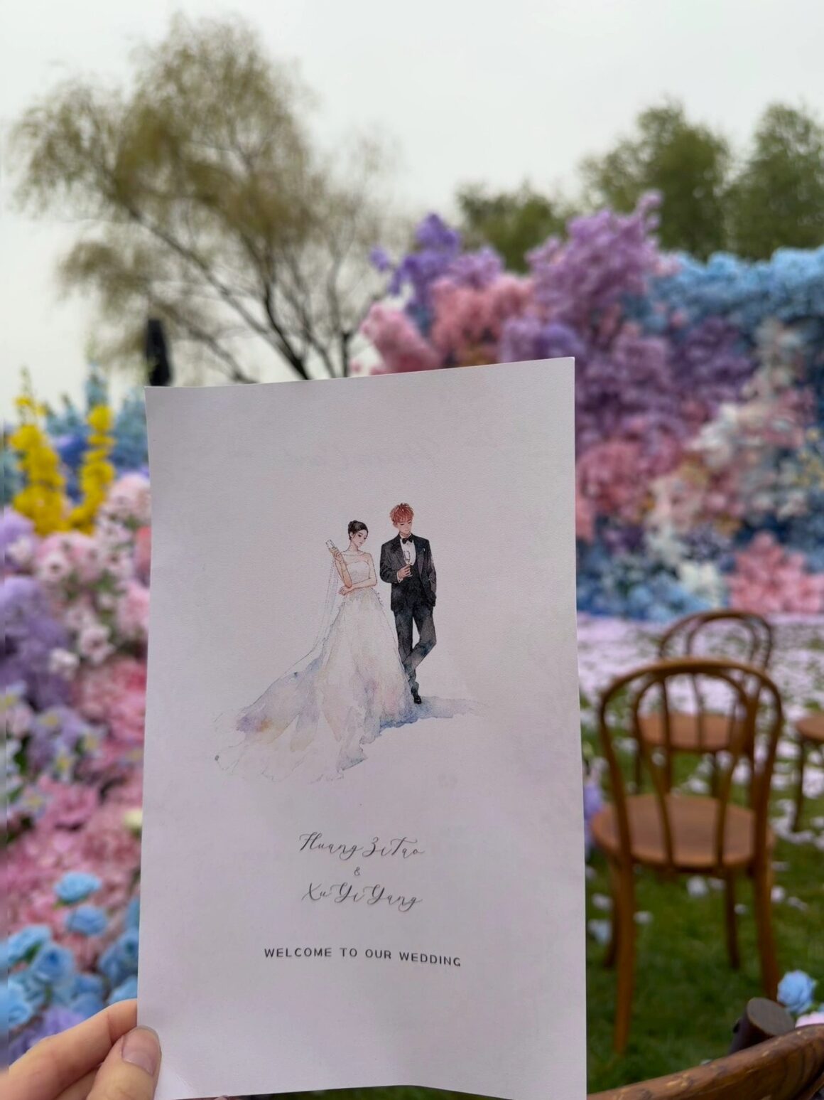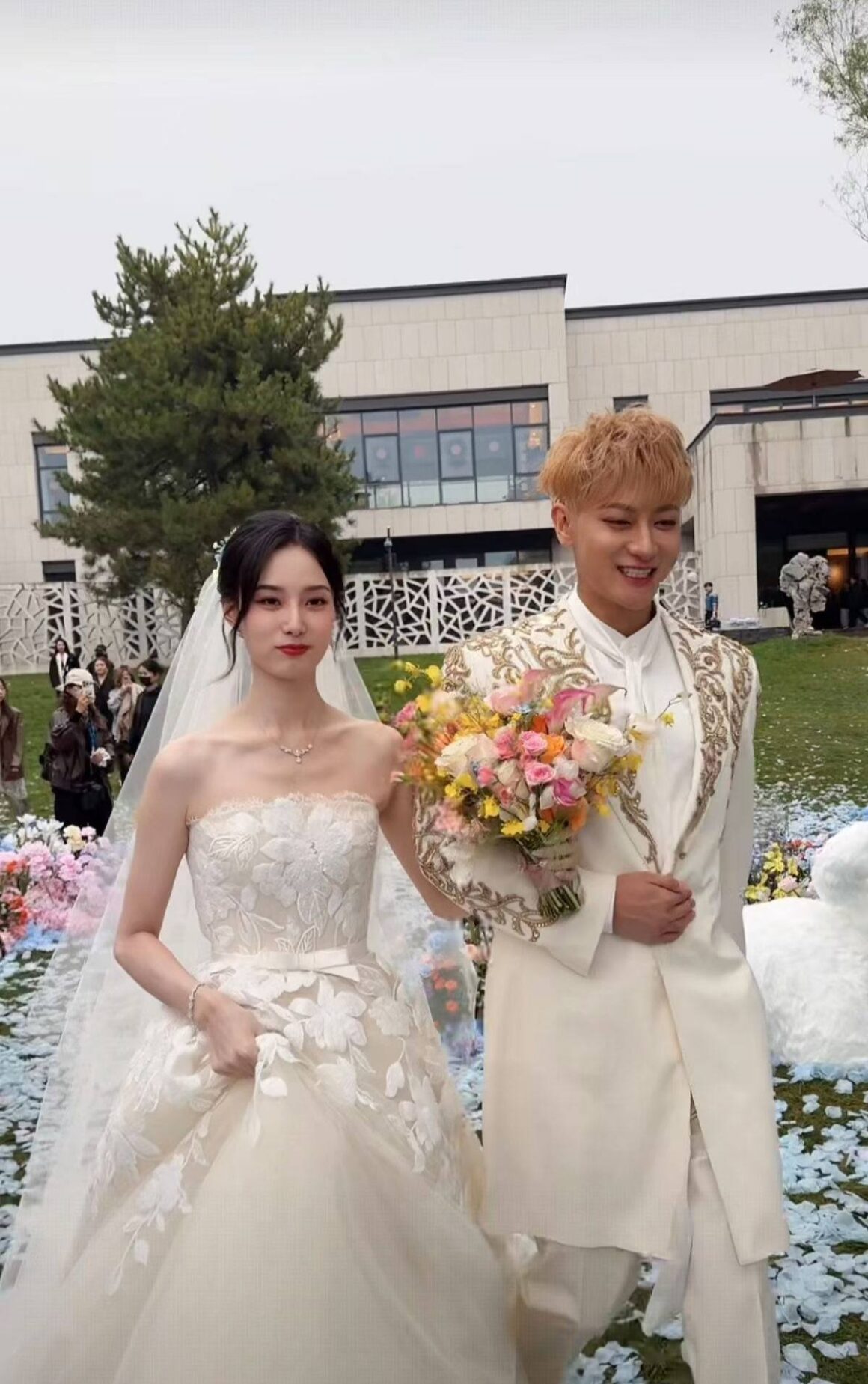 Yiyang graced the aisle in an ethereal white gown adorned with delicately woven flowers and a flowing train that trailed like stardust, an embodiment of grace and quiet power.