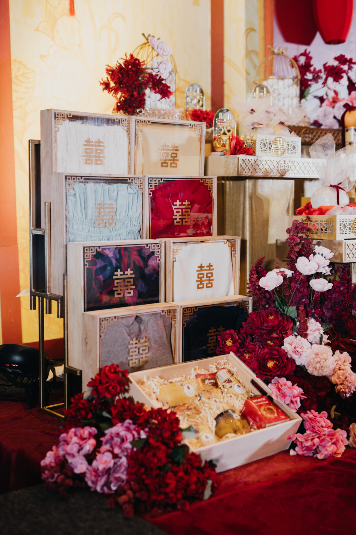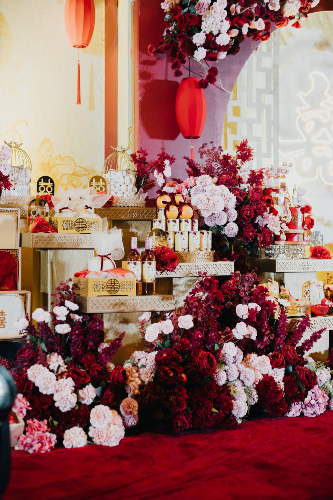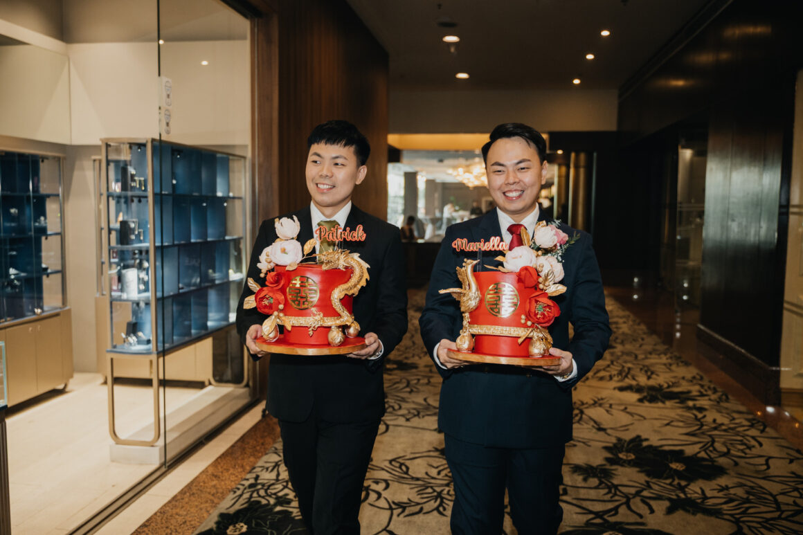 The ceremonies unfolded one meaningful moment at a time: the symbolic backward walk, the respectful serving of tea, the cake routing, and finally, the sharing of misua. “We kept our main colorway red. We also tried to keep it as traditional as possible,” shares Mariella.