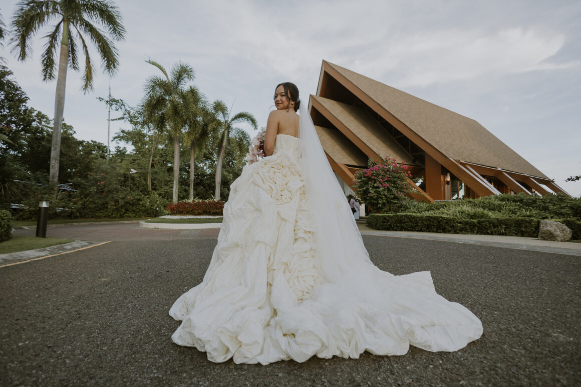 Erika wore a sculptural Francis Libiran gown adorned with pressed flowers, paired with her grandmother’s jewelry. Later, she changed into her paternal grandmother’s Filipiniana dress; a tribute to the women who shaped her.