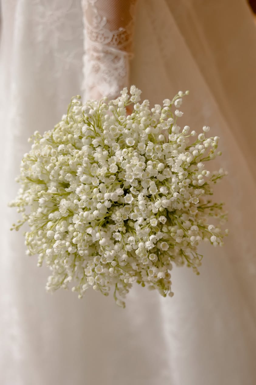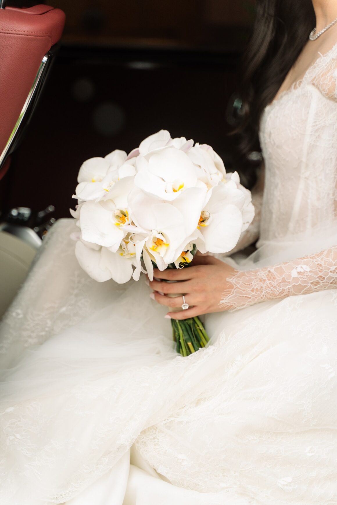 Avoid gripping too tightly. Keep your elbows soft and shoulders relaxed for a natural, graceful look, especially while walking down the aisle.