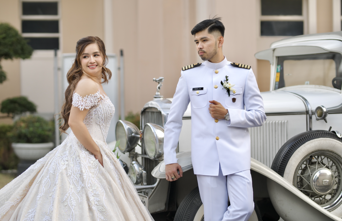 Bianca arrived in an ivory ball gown with a long train, adorned with delicate beadwork and Swarovski crystals. “Elegance isn’t about price,” she shared. “It’s about meaning.” Adrian wore his dress white officer’s uniform, proudly honoring his roots as a Maritime Academy graduate. They rode in a vintage 1929 Cadillac, while cadets rendered ceremonial honors, an unforgettable tribute.