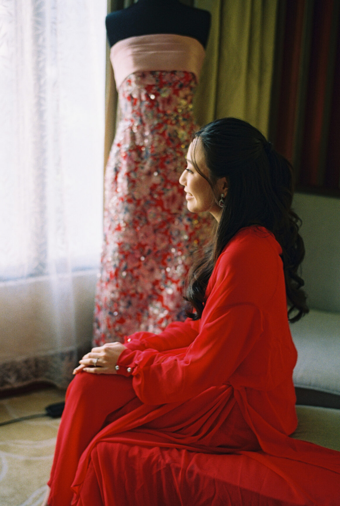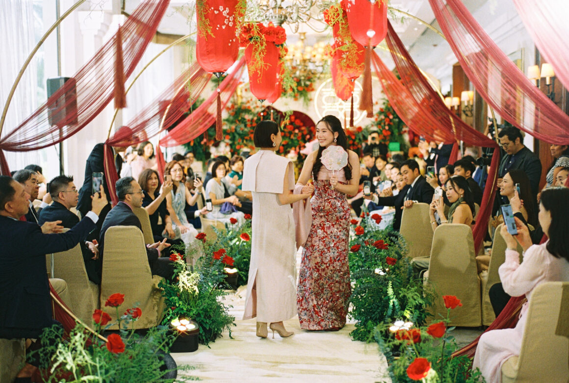 Designed in a deeper shade of red, the gown featured delicate embroidery inspired by her mother’s own ting hun dress. “It felt very full circle,” she shared. “Like I was honoring the women in my family while stepping into my own moment.”