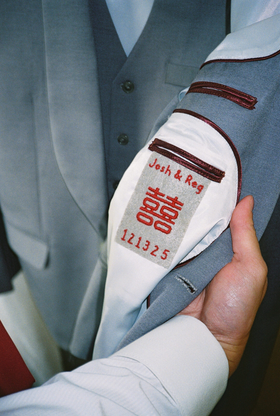 Their attire reflected that same balance of tradition and personality. Joshua wore a custom three-piece suit by Joey Samson, complete with subtle red details and meaningful stitching hidden inside, symbols, names, and their ting hun date, meant only for him to carry. Regina, on the other hand, wore a gown by Banggo Niu, a longtime family friend who had dressed her for milestones over the years.