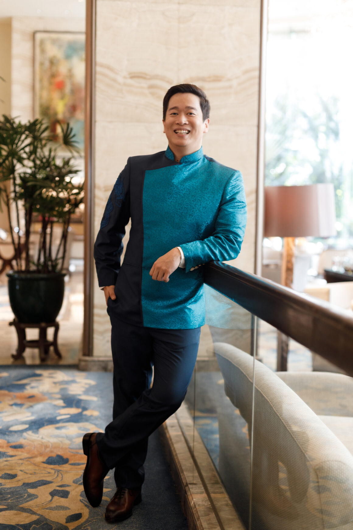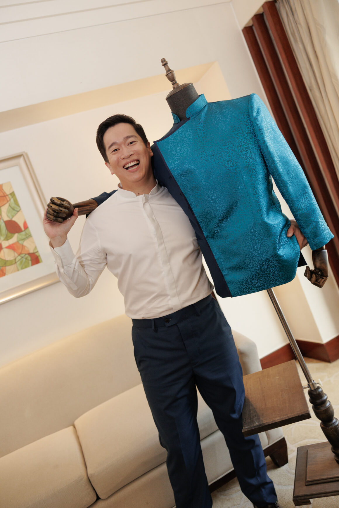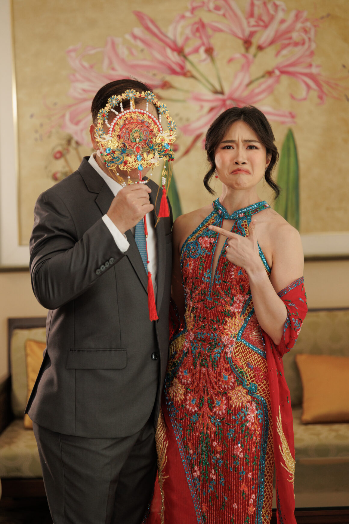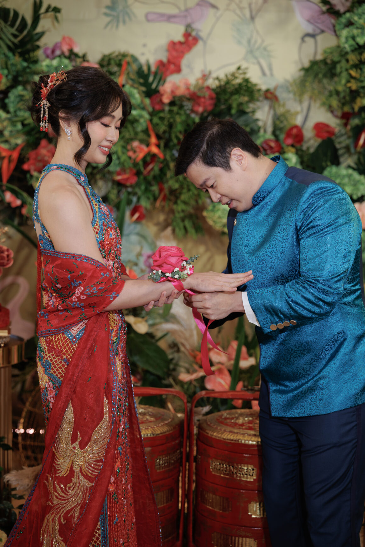 Their outfits reflected this perfectly: Kit wore a teal suit with a subtle dragon crawling along the sleeve, while Jennine donned delicate phoenix details on her arm scarves.